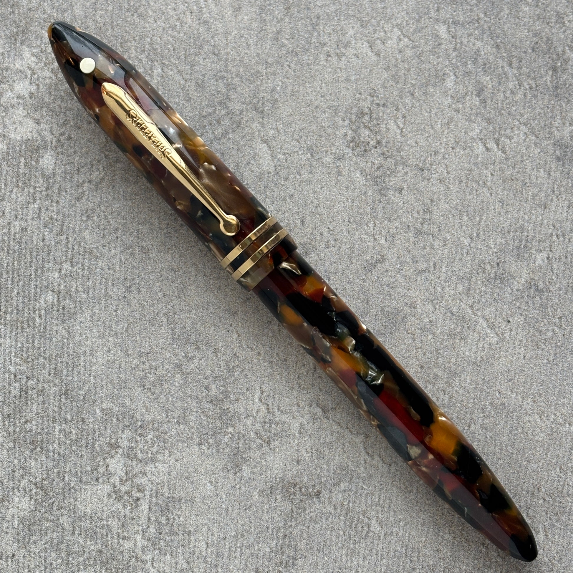 It is in excellent condition, with no chips, cracks, or dents. Beautiful brown and black pearly cap and barrel. A very nice pen with an awesome nib!