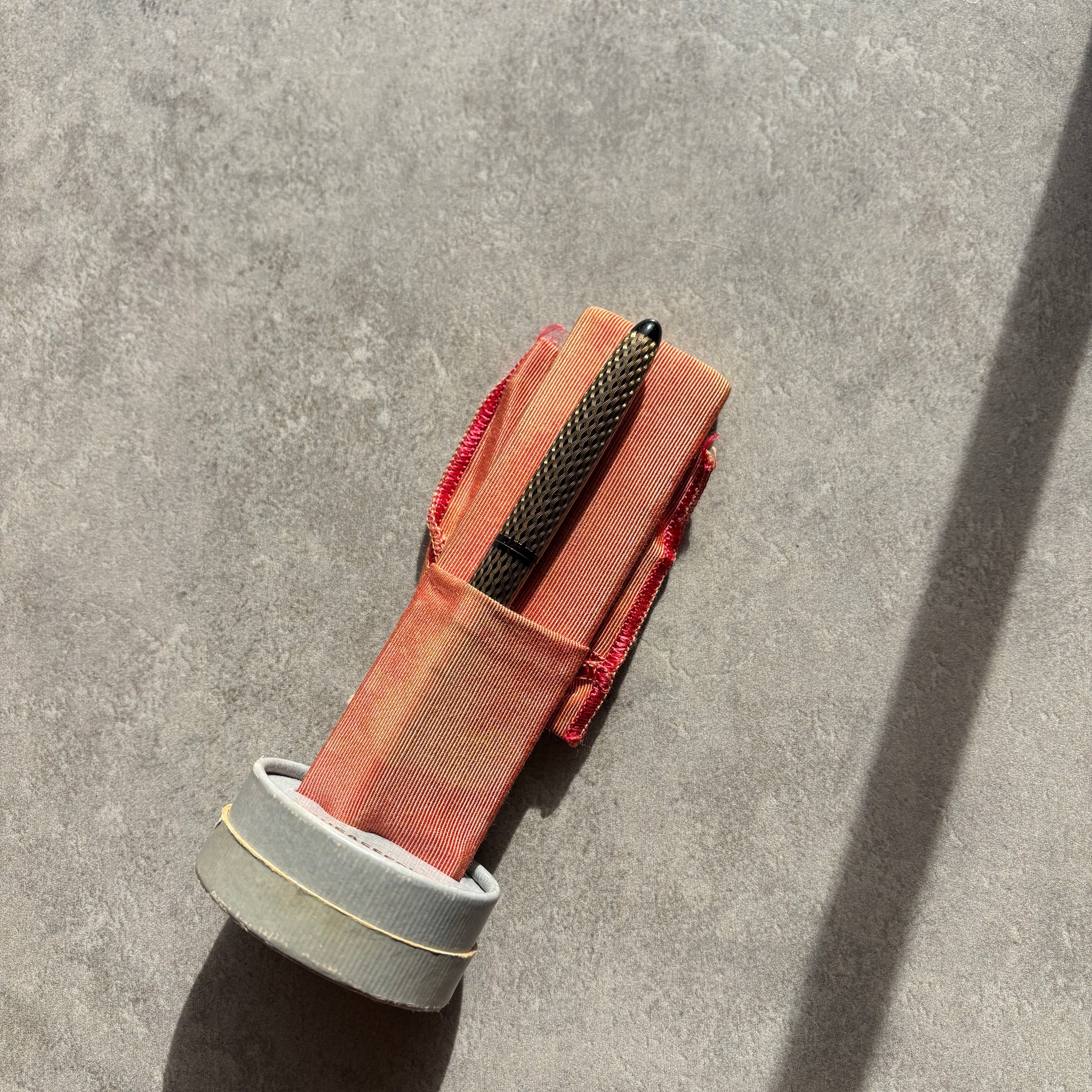 Condition: In excellent condition, this pen comes in one of the coolest boxes. It is an upright tube that holds the pen in a fabric purse case and small fabric pouch to hold a package of Skripsert ink cartridges. The case does show some wear and the purse pouch has some staining.