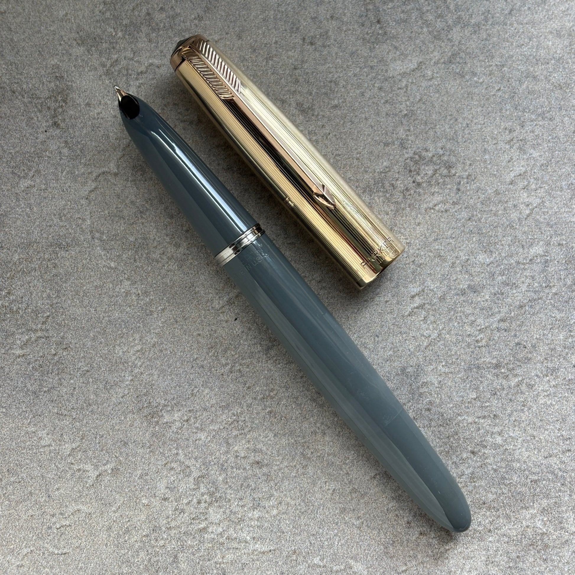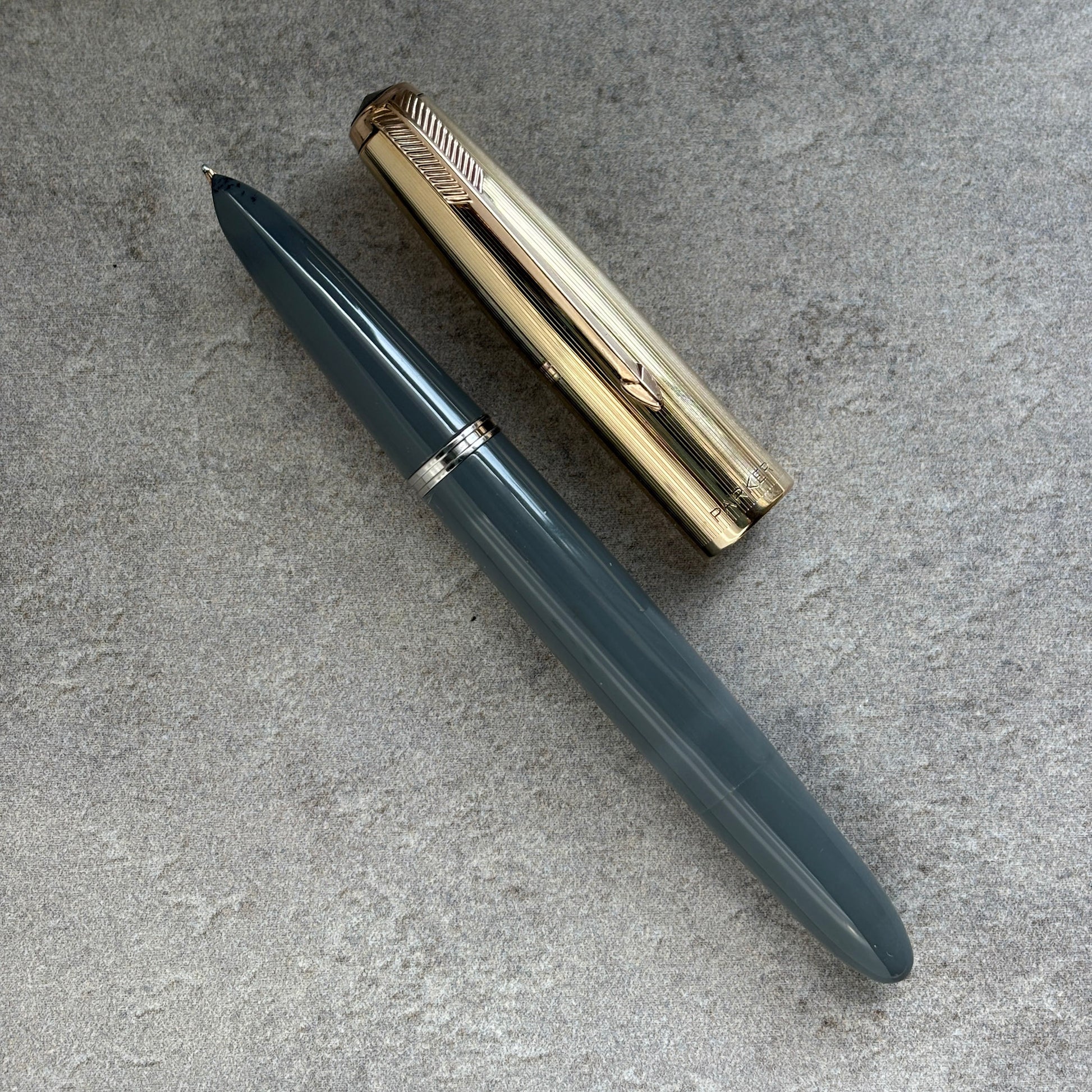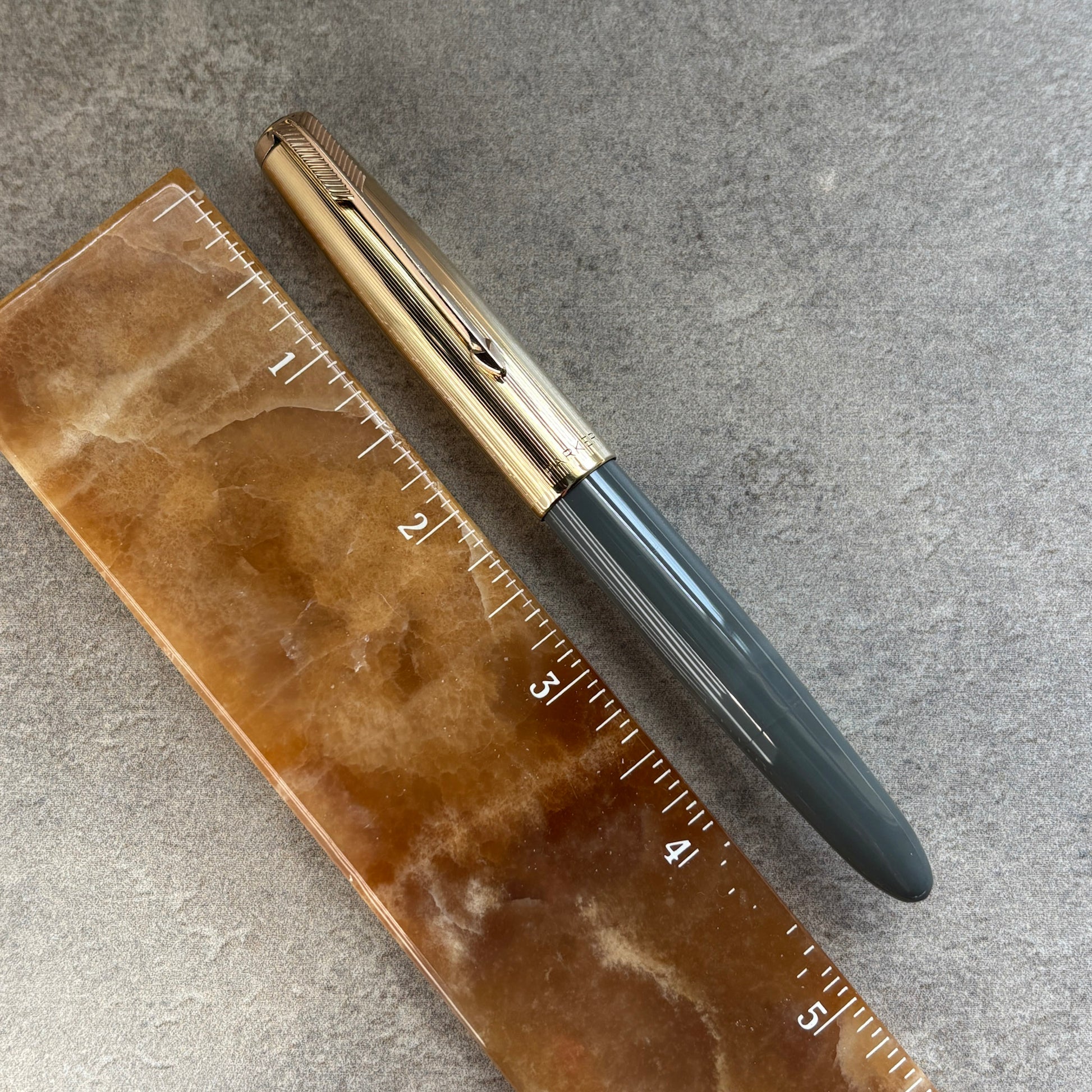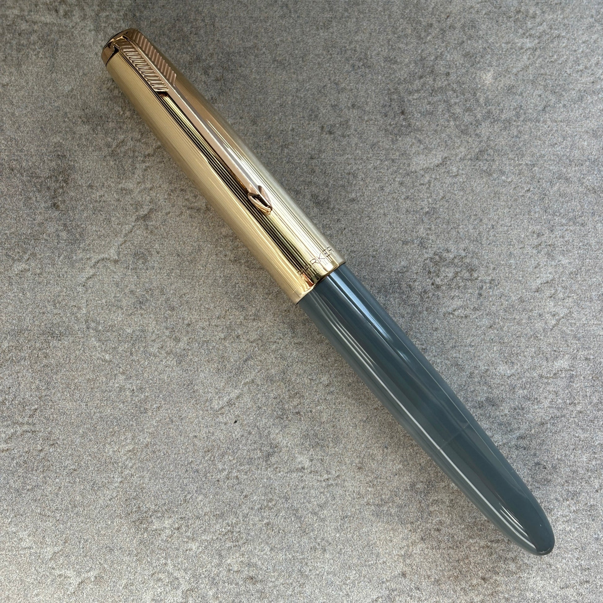 Parker 51 Demi Vacumatic, Dove Gray, Gold Filled Lined Cap, Fine 14K gold nib