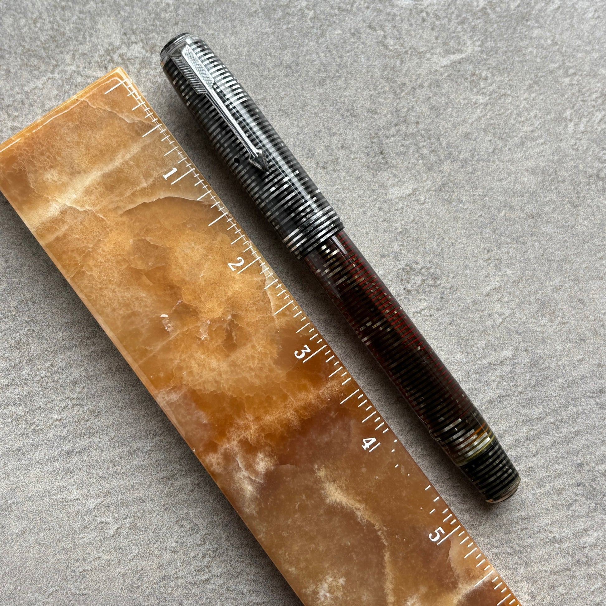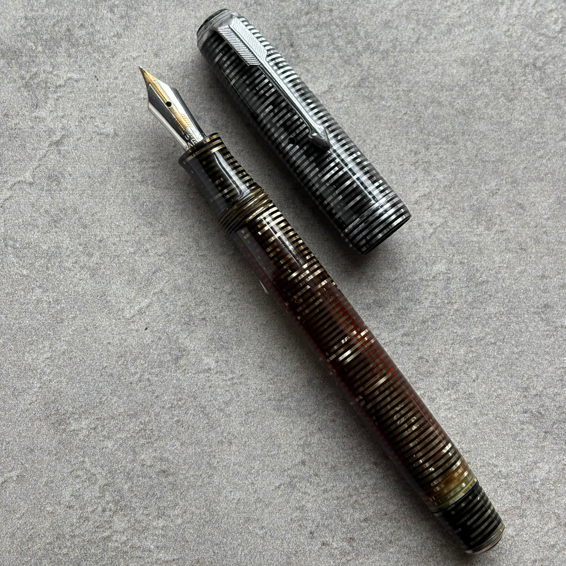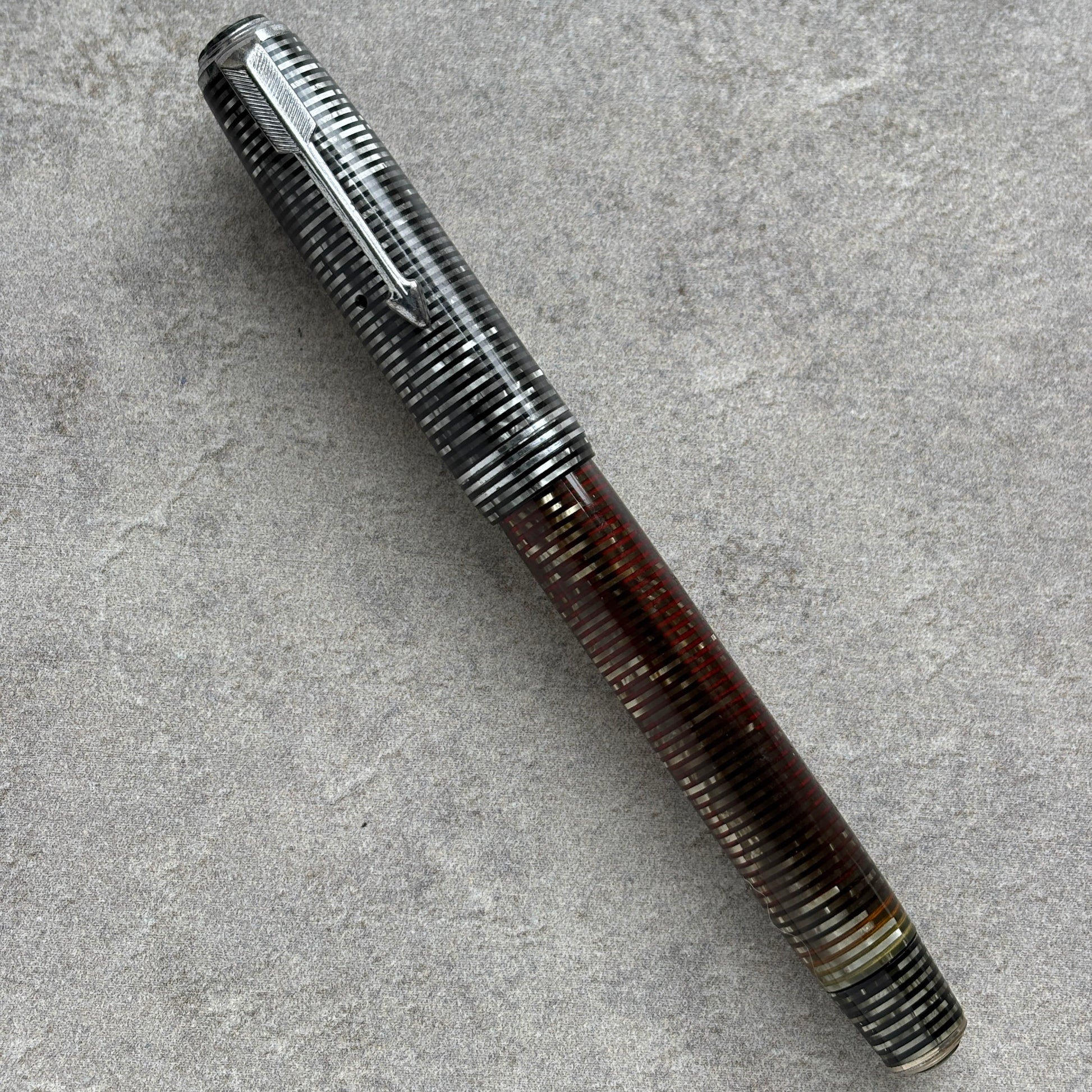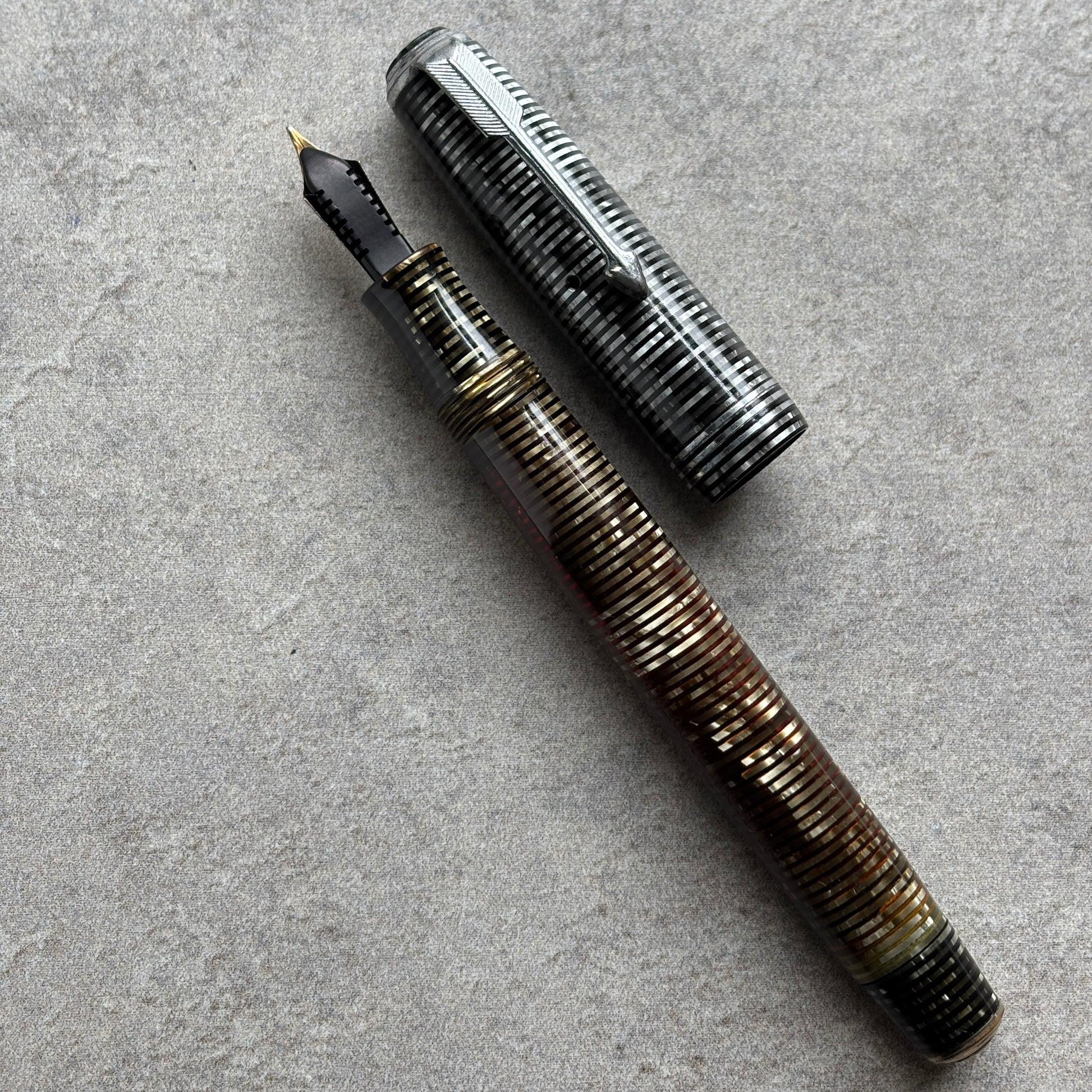In very good condition with no cracks, chips, or dents, the barrel has some ambering. I like the early Parker VacuuMatics as they have a more chunky appearance. A super nice two tone arrow medium nib.