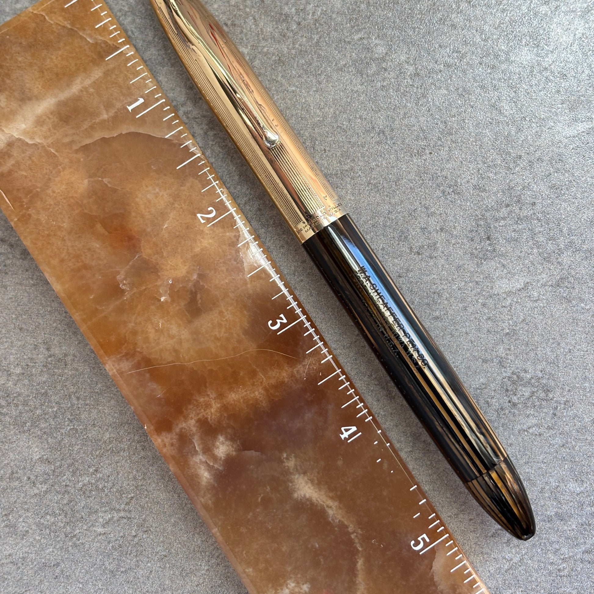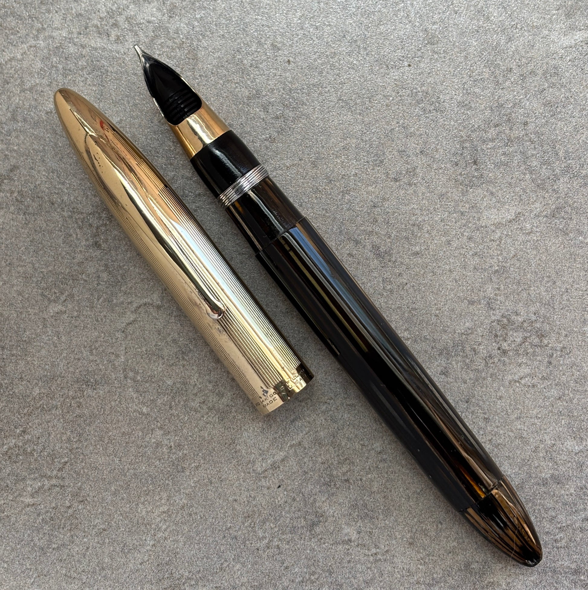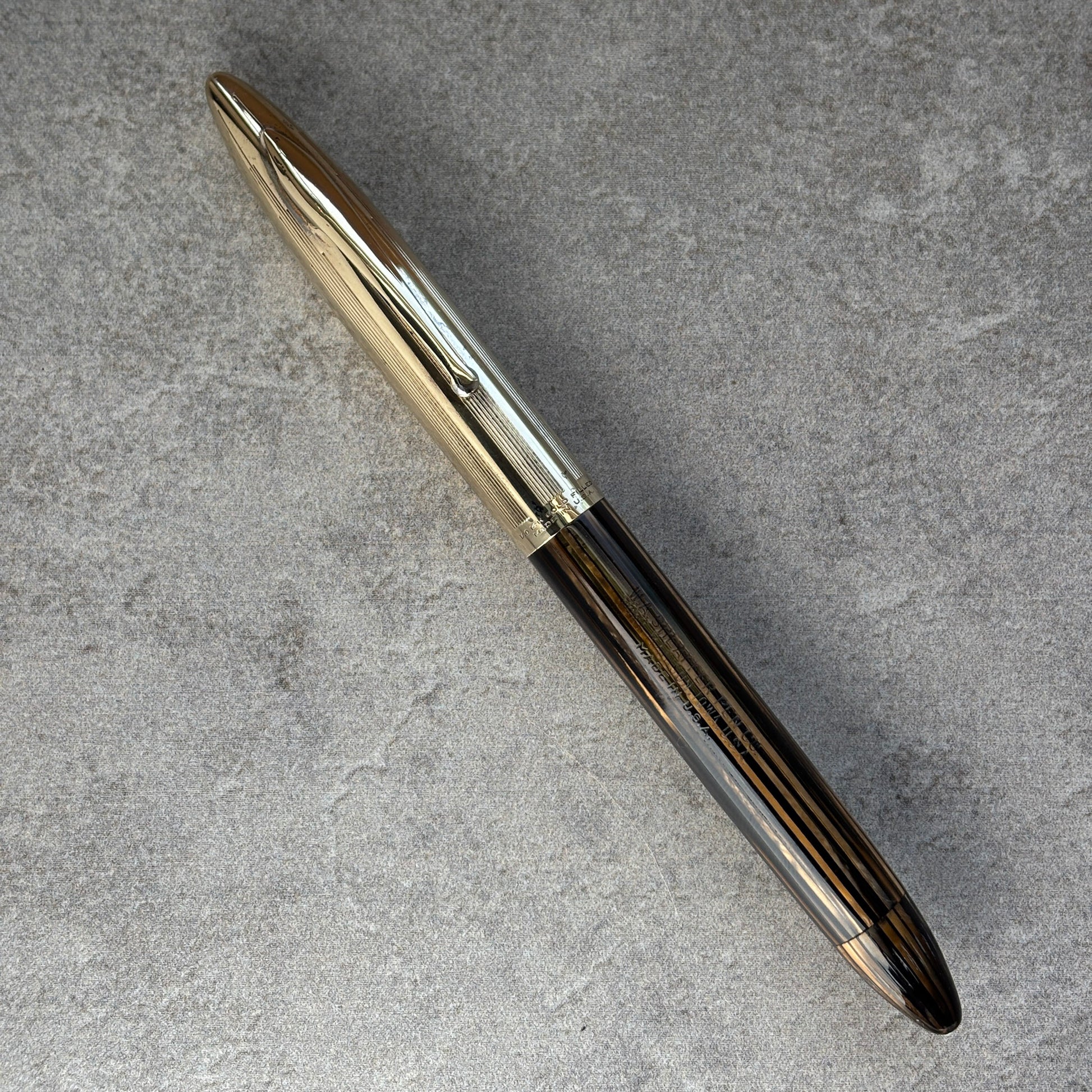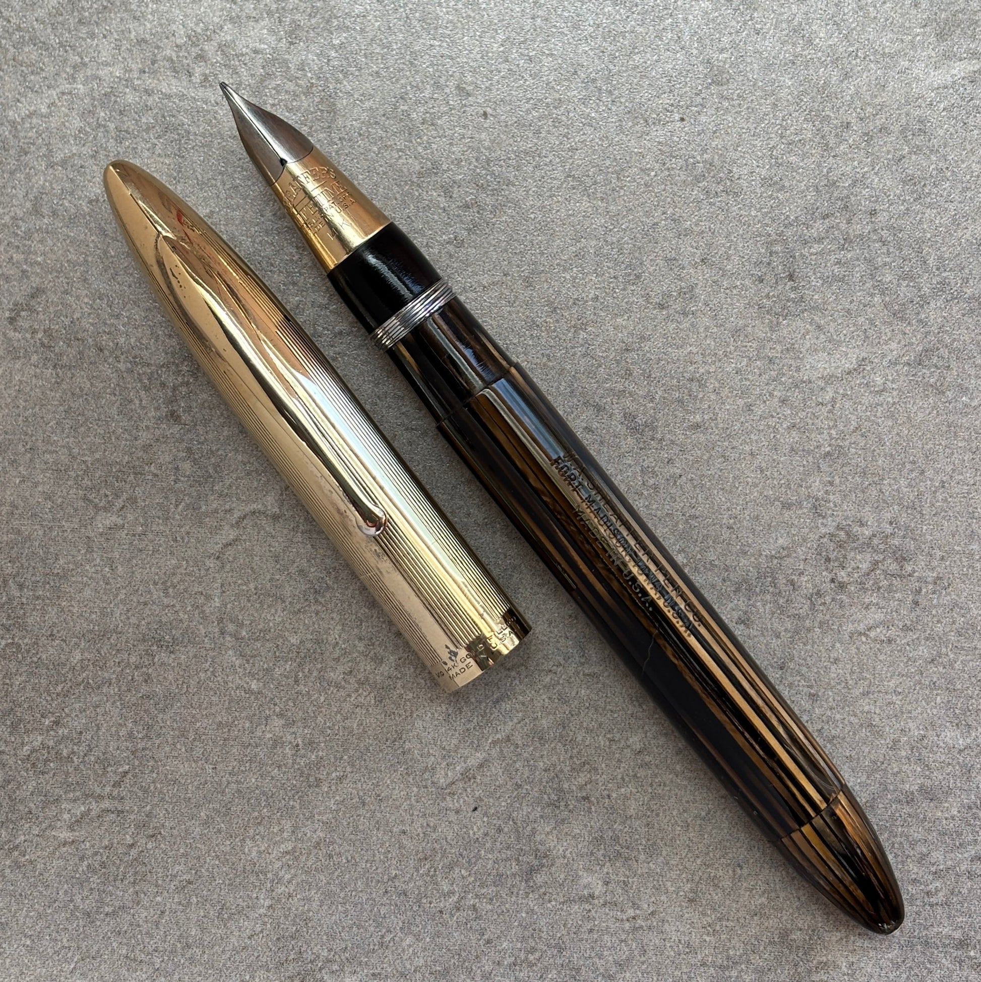 Excellent condition with no chips, cracks, or dents. It is really great to see an eighty-year-old pen cap that doesn't have a dent! Beautiful golden brown barrel that is gin-clear. Great imprints and no brassing. The white dot is on the end of the barrel.