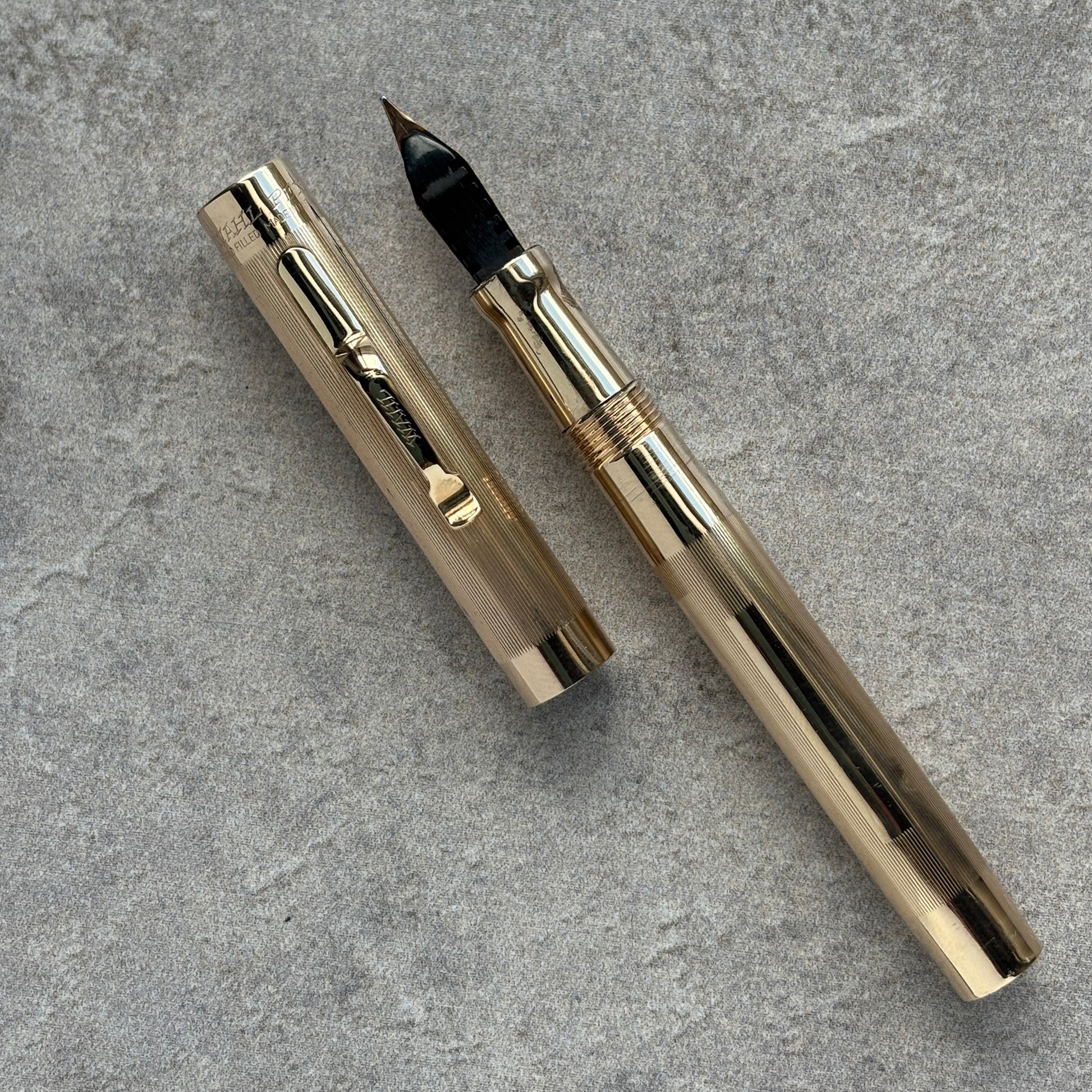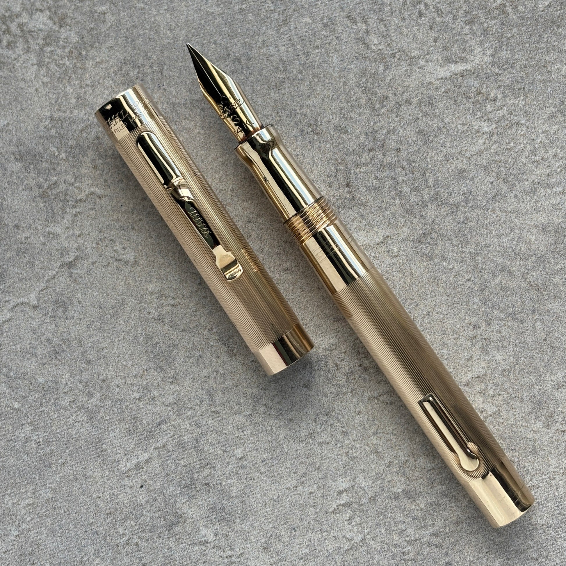 Condition: This is in excellent condition with no dents, cracks, or chips. No brassing in the gold-fill. The number 3 nib is fine and a flexible writer for everyday use.
